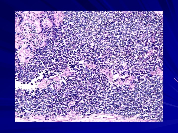 Gross: This Th tumor has a soft, lobulated, white to tan appearance. Micro: sheets of blue cells are regular, and round molded nuclei and a moderate amount of eosinophilic cytoplasm. Blue round cells