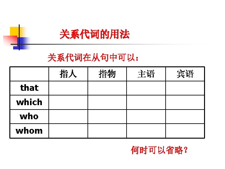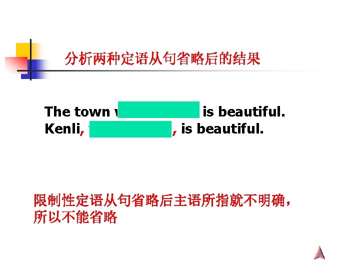 非限制性定语从句 Please compare: Teachers who are kind are popular with the student Mr Wang, who is kind, is popular with the students. The town where I live is beautiful. Kenli, where I live, is beautiful. 形式 作用 限制性定 修饰限定 语从句 非限制性 插入成分 补充解释 定语从句 能否省略 翻译 不能 能 …. 的