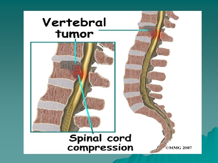 Diagnosis u In the history - especially in a known cancer patient. u MRI spine – urgent u Referral to Oncology - urgent