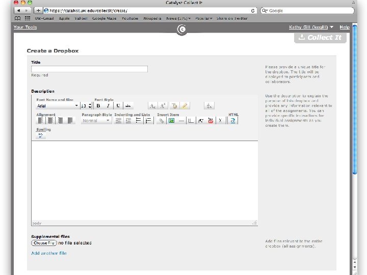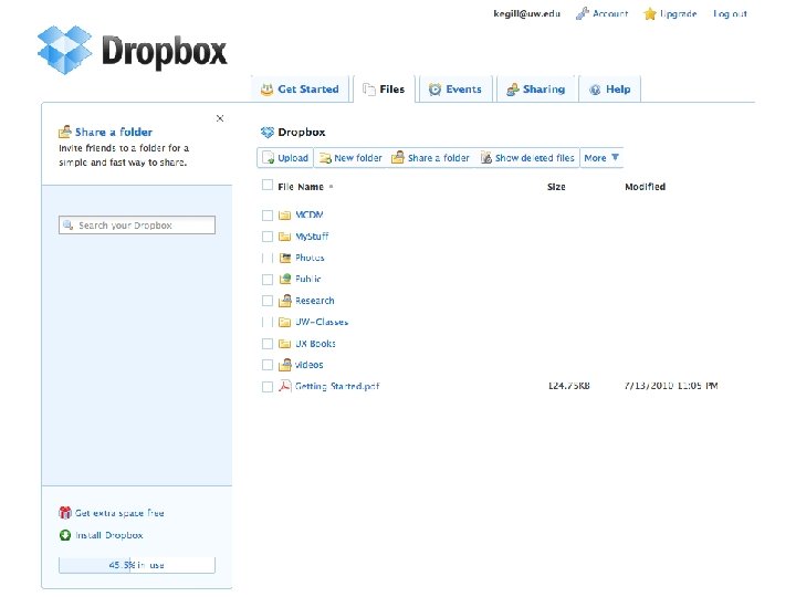 File Sharing • Catalyst Collect. It – Confusing because it uses the term “dropbox” • Drop. Box – Automagically syncs between laptop, mobile devices and the cloud – Getting An Account • Anyone with Drop. Box account • Anyone who wants a Drop. Box account