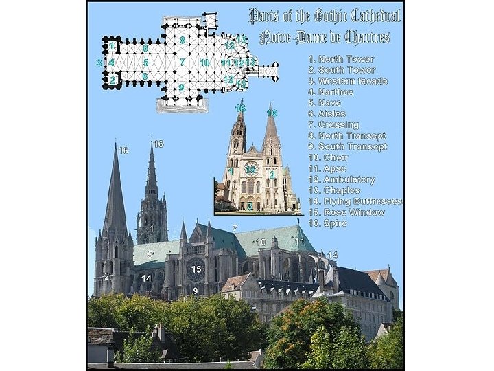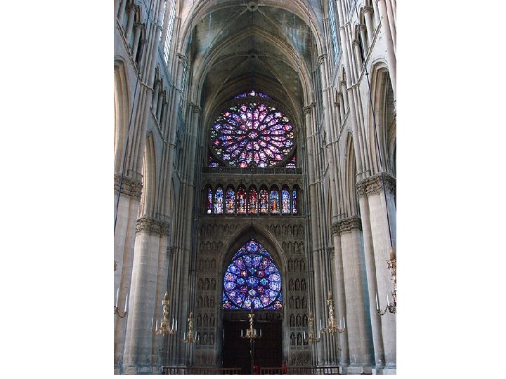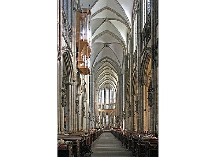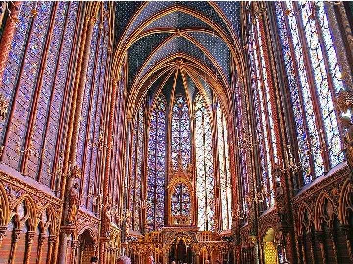 Gothic Architecture • Cathedrals, “cities of God” – 800 s-1100 s – Large churches built in city areas – Filled with riches that Christians could offer – Gothic: from Germanic tribe of Goths • Cathedrals stretch up as if reaching to heaven • Stained glass windows, ribbed vaults, flying buttresses, pointed arches, tall spires • Sculpture, wood carvings, vaulted ceilings • Meant to inspire worshipper with magnificence of God