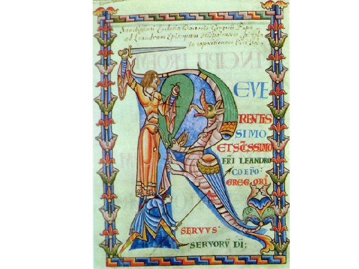 Germanic Kingdoms • Boundaries shift, government changes – – Family ties, personal loyalty rather than to a state Small communities with unwritten rules/traditions Chief leads village, provides food, weapons, treasure Not logical to be allegiant to a king not known • Church converts many Germans – Builds monasteries • Monks, nuns give up private possessions and devote lives to serving God • Monasteries as places of great learning • Pope Gregory I (590) – Broadens power of papacy beyond spiritual role • Secular (worldly), involved in politics • Uses money of church to fund armies, roads, help poor • Believed that region from Italy to England Spain to Germany was his responsibility