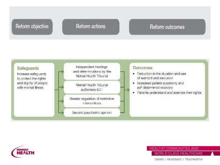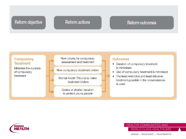 Mental Health Tribunal MHT will make order for /approve • Compulsory treatment beyond an initial 28 day period, including duration and the setting the order will take place. • All orders will be time limited • Applications can be made for further treatment orders by Authorised Psychiatrist – must be done before current order expires. • Consumers will still be able to appeal to the MHT – this will be called a application for revocation.