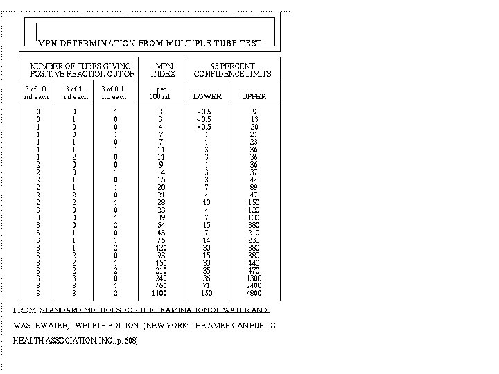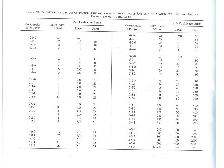 MPN table • • • Most Probable Number (最大可能數) 單位為 MPN,而非CFU Probability (機率) 測低數目菌量 取 100 m. L ,若有皆為負,則表示 3/1的100 m. L 的樣品無細菌,<3 MPN/100 m. L • 3 -tube (33. 3 m. L) and 5 -tube (55. 5 m. L)