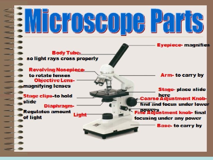 Compound Microscope • Lenses: Ocular and objective (with mirror) • Body tube or head: hollow tube that holds the objective and eyepiece lenses • Stage: platform that supports the specimen • Lenses (Eyepiece and objectives)- magnify • Diaphragm- regulates amount of light. • Coarse Adjustment knob- to find and focus under lower powers • Fine adjustment knob- to final focus under any power