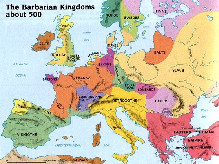 Barbarians Ruled Western Europe n By 500 A. D. Western Roman Empire fell to barbarian tribes: –Visigoths controlled Spain –Ostrogoths controlled Italy –Franks controlled Gaul (France) –Vandals controlled North Africa –Angles, Saxons, Jutes battled for Britannia –Celts ruled Ireland & Scotland