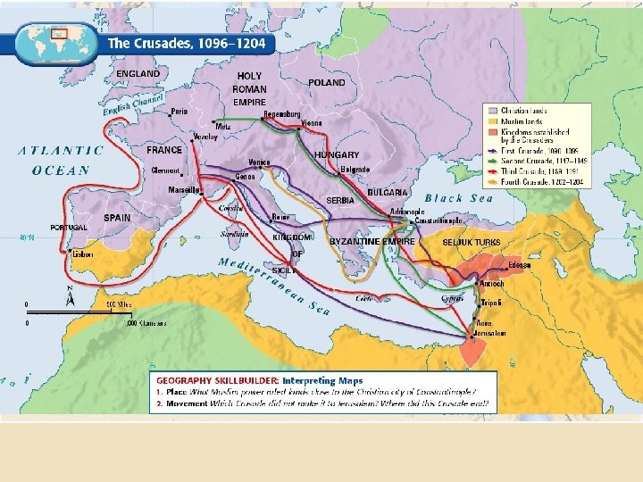 III. Western Christendom: Rebuilding in the Wake of the Roman Collapse D. Europe Outward Bound: The Crusading Tradition 1. Merchants, diplomats, and missionaries: These Europeans established connections to the outside world and taught an isolated Europe what was out there. 2. Christian piety and warrior values: The crusading spirit combined the two most important forces of the Middle Ages: religious piety and the warrior ethos. Evidently, the European knights were able to overcome Jesus’ teachings about peace and love. 3. Seizure of Jerusalem, 1099: The siege and taking of Jerusalem ended in a massive massacre of Muslims and Jews in the very place where Jesus was to have walked and taught his message of love. 4. Crusader states, 1099– 1291: These were states in the Middle East held by crusading knights for almost two centuries. (7 -8 Crusades) 5. Islam and Byzantine Orthodox Christianity were both targets. https: //www. youtube. c om/watch? v=X 0 zud. T Qelz. I (crash course)