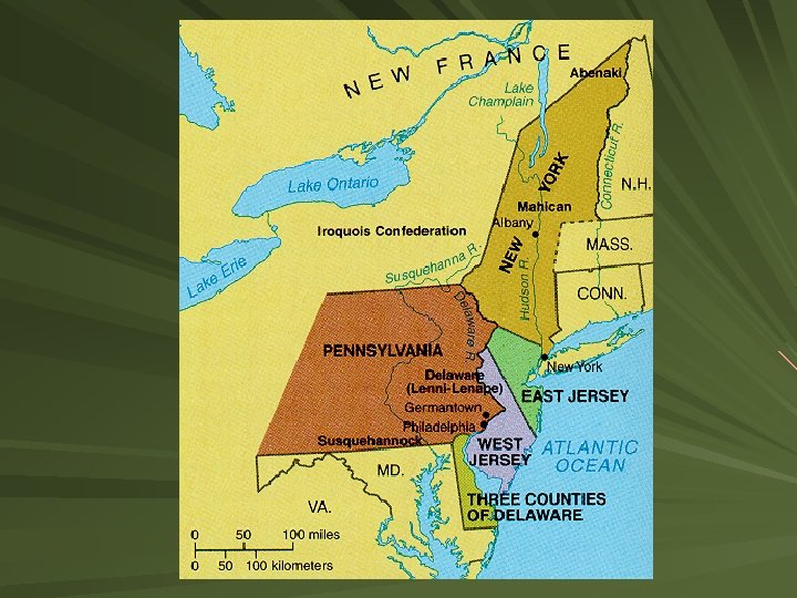 Pennsylvania Established in 1682 by William Penn Religious group: the Quakers Pacifists: people who refuse to use force or to fight in wars Penn saw Pennsylvania as a “holy experiment” put ideals of toleration and equality into practice By 1683, more than 3, 000 English, Welsh, Irish, Dutch and German settlers had arrived