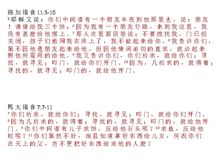 Read aloud together: Luke 11: 5 -10 5 Then he said to them, “Suppose one of you has a friend, and he goes to him at midnight and says, ‘Friend, lend me three loaves of bread, 6 because a friend of mine on a journey has come to me, and I have nothing to set before him. ’ 7 “Then the one inside answers, ‘Don’t bother me. The door is already locked, and my children are with me in bed. I can’t get up and give you anything. ’ 8 I tell you, though he will not get up and give him the bread because he is his friend, yet because of the man’s boldness he will get up and give him as much as he needs. 9 “So I say to you: Ask and it will be given to you; seek and you will find; knock and the door will be opened to you. 10 For everyone who asks receives; he who seeks finds; and to him who knocks, the door will be opened. Matthew 7: 7 -11 7 “Ask and it will be given to you; seek and you will find; knock and the door will be opened to you. 8 For everyone who asks receives; he who seeks finds; and to him who knocks, the door will be opened. 9 “Which of you, if his son asks for bread, will give him a stone? 10 Or if he asks for a fish, will give him a snake? 11 If you (sinful people), then. . know how to give good gifts to your children, how much more will your Father in heaven give good gifts to those who ask him!