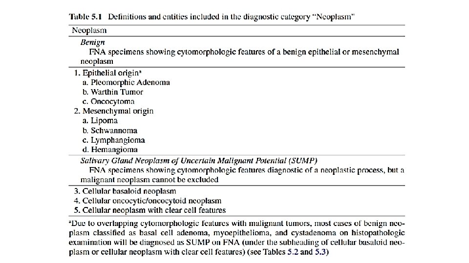 Neoplasm: Benign: when an FNA specimen shows characteristic cytomorphologic features of a specific benign epithelial or mesenchymal neoplasm of the salivary gland. The most common being PA and WT. Salivary Gland Neoplasm of Uncertain Malignant Potential (SUMP): FNA specimens where the cytomorphologic features are diagnostic of a neoplastic process, but the cytologic findings cannot effectively distinguish between a benign and malignant neoplasm. Most malignant tumors included in this diagnostic category will be low-grade carcinomas
