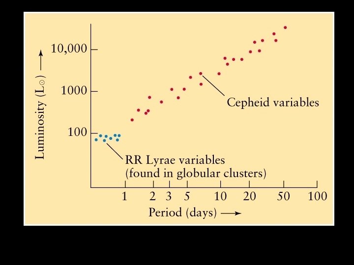 Finding the center of the galaxy • In early 90 s Henrietta Levitt discovered that the pulsation period of a Cepheid is directly related to it Luminosity. • Shortly after Harlow Shapley discovered an identical relation in RR Lyrae stars. • So, by measuring the pulsation period, we can know the luminosity, and from observations we can determine the apparent brightness of the star. Once luminosity and apparent brightness and luminosity are known, the distance can be determined.