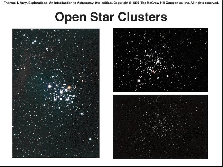 Star clusters • Globular – 105 to 106 stars, large, located in halo and nucleus (bulge) of galaxy, older stars (Pop II), no gas or dust • Open – few hundred stars, small, located in spiral arms, young (Pop I) stars, no gas or dust • Associations – very large, lie along spiral arms, very young blue stars, still contain gas and dust