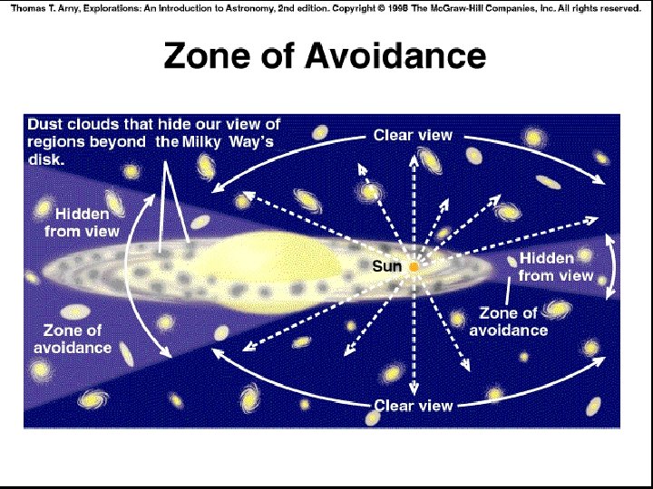 Interstellar Matter: Gas and Dust • Dust – extremely sparse – very efficient at blocking visible light – blocks most of Milky Way from view in disk – “zone of avoidance” is region of sky along galactic disk where our view is blocked by dust – only infrared and radio can penetrate dust (see COBE photo of galaxy in infrared)