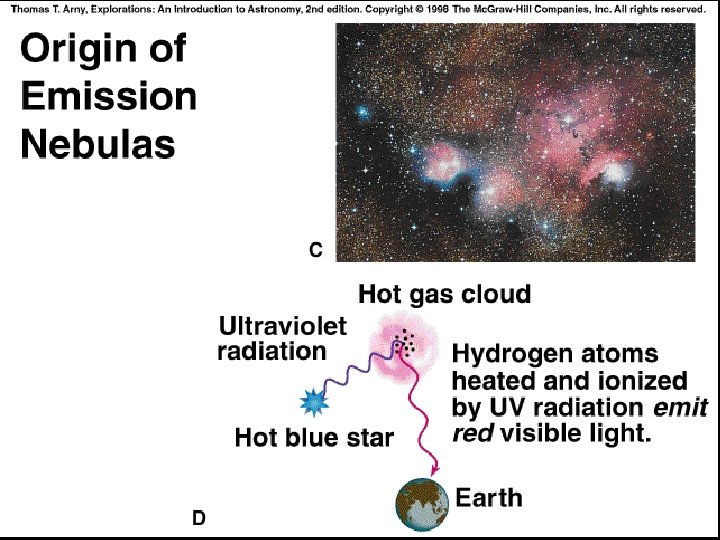 Interstellar Matter: Gas • Gas – 90% hydrogen, 10% helium (by number) – can have molecules – cold gas: detected by absorption spectrum – emission nebula: emission spectrum, gas heated by nearby hot stars. Typically look red in pictures (hydrogen emission lines in the red part of spectrum). Called HII region.