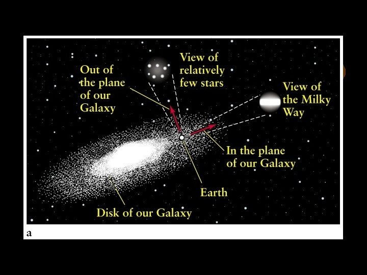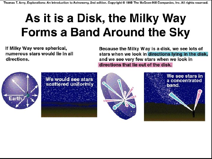 Finding the center of the galaxy • The interstellar dust is concentrated in the plane of the galaxy, and therefore obscures our view of stars within the galactic plane. – Interstellar extinction • Like a motorist determines his position on a foggy day by looking for tall buildings that extend above the fog and are visible, astronomers determine the location of the galactic center from our view point by looking at stars (Globular Clusters) that are lie outside the galactic plane.