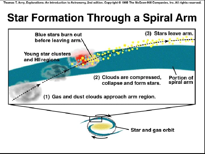Why are there spiral arms? • Density waves - these denser regions are created when fast moving interstellar gas & dust moves into slow moving density waves or spiral arms. Then, this fast moving gas and dust gets compressed into a nebula. – This compression begins the process by which new stars are formed.