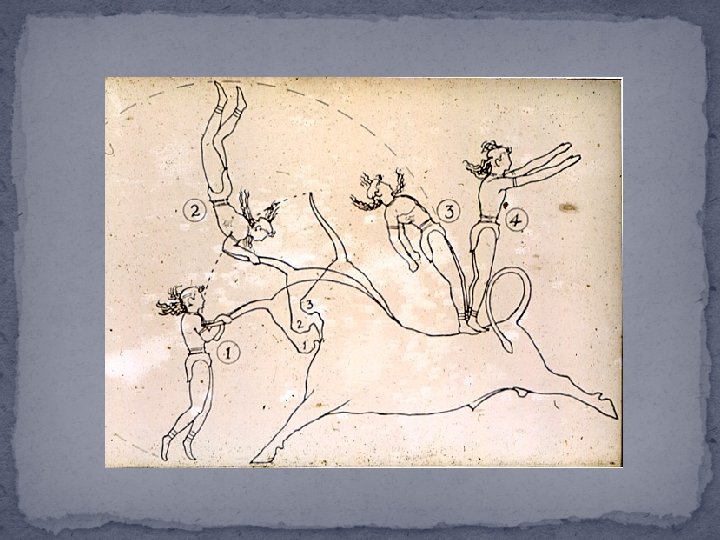 Minoan Society � Peaceful � Paintings of natural world � Enjoyed music and dancing � No army, no navy � High degree of equality between sexes � Family and royal names passed down through daughter � Worshipped goddesses, not gods � Extreme sports enjoyed by both girls and boys � High standard of living � Bright, airy buildings (natural air conditioning) � Hot/cold water, flush toilets � Apparent over-abundance of food � But… a dark side too � Practiced human sacrifice
