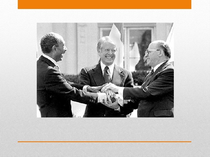 • In 1976 Georgia Democratic Governor Jimmy Carter beat Ford for the presidency. • Carter’s administration was heavily influenced by international issues. • One highlight was the Camp David Accords, a peace agreement between Egypt and Israel in 1978. • The Camp David Accords were the first signed peace agreement between the nations of the Middle East. Jimmy Carter