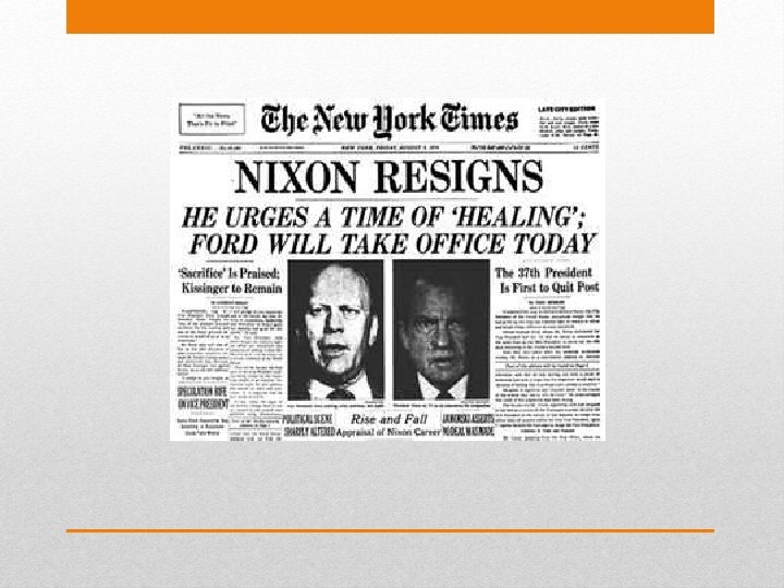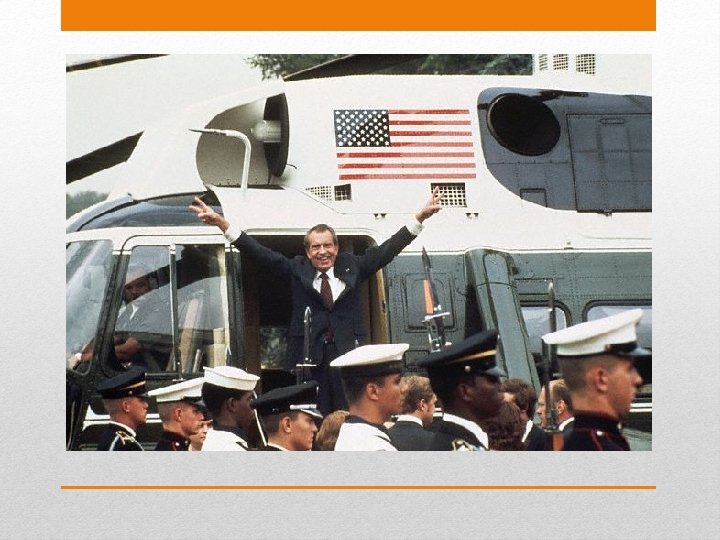 • Due to mounting public pressure and a threat of impeachment, Nixon chose to resign from office. • Nixon officially announced his resignation in August 1974. • This make Richard Nixon the first and so far only President to ever voluntarily leave office. • The Watergate scandal caused many Americans to lose confidence and trust in a government they viewed as corrupt and untrustworthy. Nixon Resigns