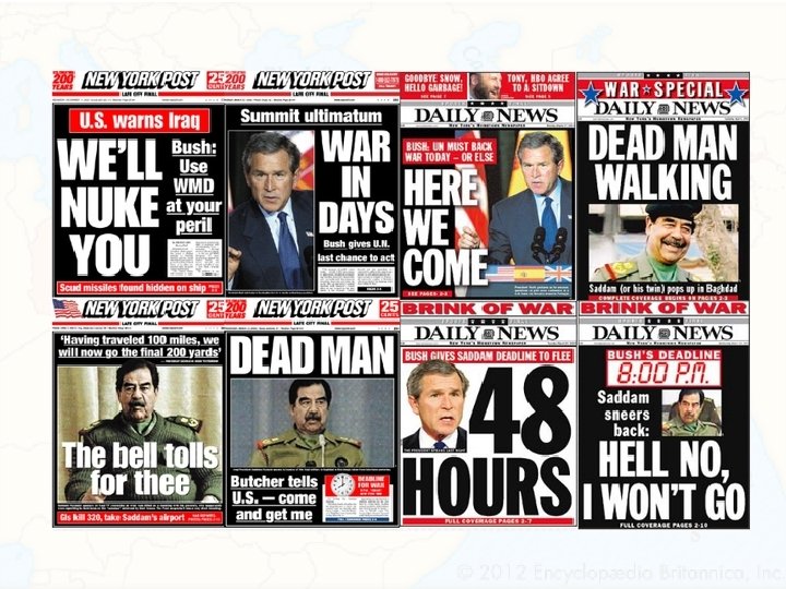 War in Iraq • In 2003 the U. S. led an invasion of Iraq based on two claims: 1. Iraq’s dictator Saddam Hussein was helping al-Qaeda 2. Iraq secretly had Weapons of Mass Destruction (WMDs) • Like Afghanistan, the war was initially successful as the U. S. ousted Saddam and held democratic elections • Between 2003 and 2011 the U. S. battled an insurgency and still has troops present overseeing the Iraqi Army’s fight against extremists • Nearly 4, 500 U. S. casualties