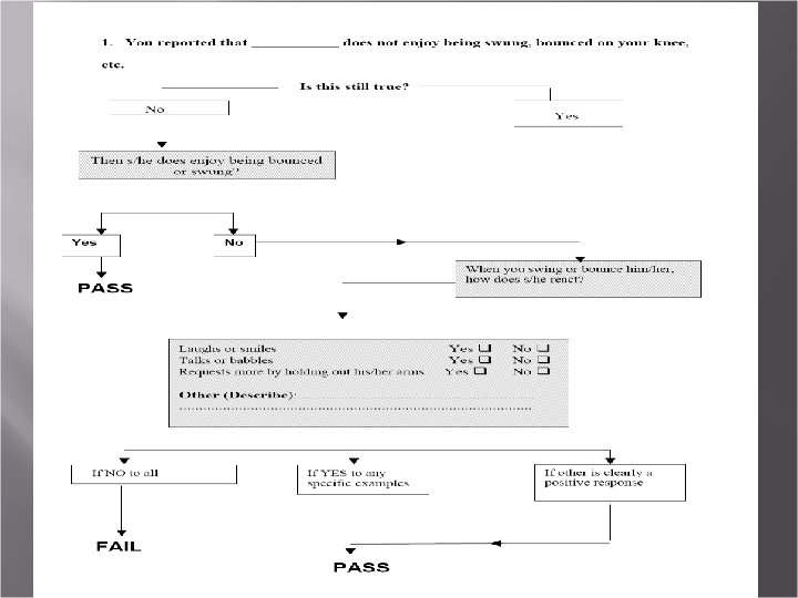 Non critical items For these items, a score of “No” indicates a risk of Autism 1. Does your child enjoy being swung, bounced on your knee, etc. ? 3. Does your child like climbing on things, such as up stairs? 4. Does your child enjoy playing peek-a-boo/hide-and-seek? 5. Does your child ever pretend, for example, to talk on the phone or take care of a doll or pretend other things? 6. Does your child ever use his/her index finger to point, to ask for something? 8. Can your child play properly with small toys (e. g. cars or blocks) without just mouthing, fiddling, or dropping them? 10. Does your child look you in the eye for more than a second or two? 12. Does your child smile in response to your face or your smile? 16. Does your child walk? 17. Does your child look at things you are looking at? 19. Does your child try to attract your attention to his/her own activity? 21. Does your child understand what people say? 23. Does your child look at your face to check your reaction when faced with something unfamiliar?