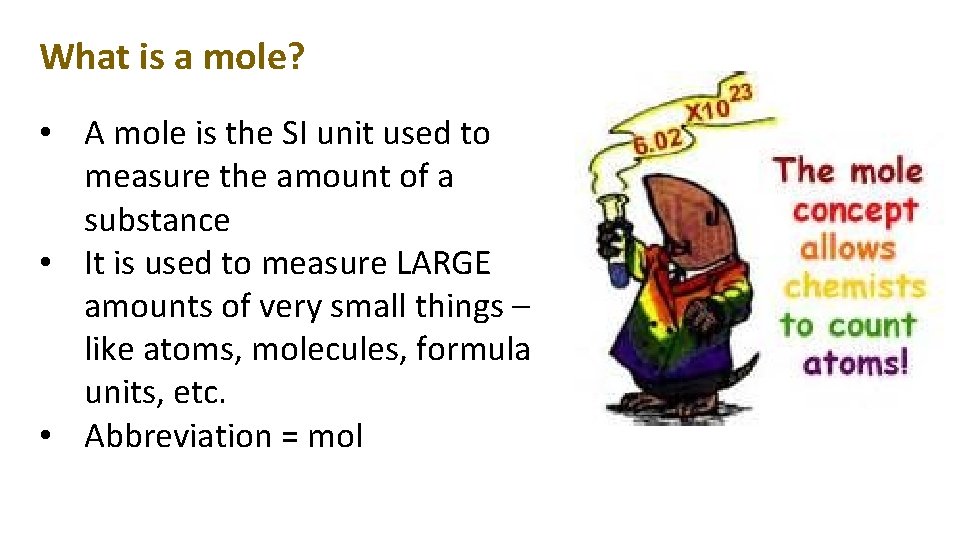 What is a mole? • A mole is the SI unit used to measure the amount of a substance • It is used to measure LARGE amounts of very small things – like atoms, molecules, formula units, etc. • Abbreviation = mol