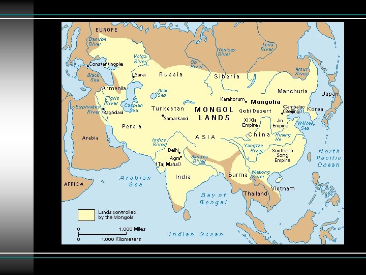 The Mongol Empire • 50 years > conquered from China to Poland • Only India and western Europe escaped the full fury of the Mongol assault • 1260 divided into Khanates • • Great Khan Chagatai Golden Horde Ilkhanate
