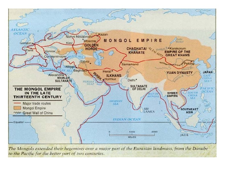 Mongol Incursions and the Retreat from Europe • Early on Christian leaders in Europe happy about Mongol dominance because Christians under Muslim rule were worse off. Mythical Prestor John- story of a monarch cut off from Europe by Muslims and was returning to power • Rulers slow to realize threat of Khan • 1240 Hungarians surrender under the leadership of King Henry of Silesia and this opens way to dominate Adriatic Sea region in the south to Poland German states in north • Death of Ogedei makes Batu flee back to Karakorum in preparation for struggle for succession, so Europe spared large Mongol invasion