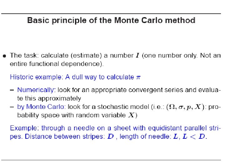 First application of Monte Carlo Method The needle experiment of Compte de Buffon, 1733 (french biologist, 1707 -1788 What is the probability p, that a needle (length L), which randomly falls on a sheet, crosses one of the lines (distance D)? (N trials, n „hits“)
