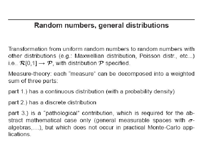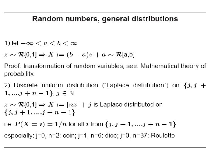 We will see next: Any continuous distribution can be generated from uniform random numbers on [0, 1] Any discrete distribution can be generated from uniform random numbers on [0, 1] Hence: Any given distribution can be generated from uniform random numbers on [0, 1]