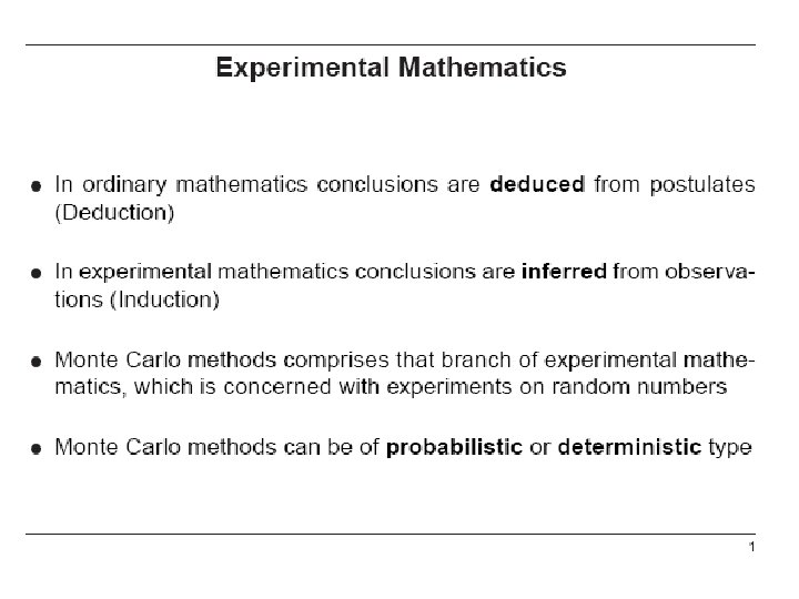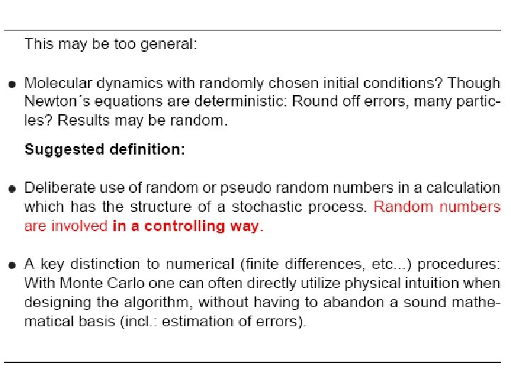 This lecture • Brief introduction: simulation • What is the Monte Carlo Method • Random number generation • Integration by Monte Carlo Tomorrow: one (of many) particular application: • particle transport by Monte Carlo