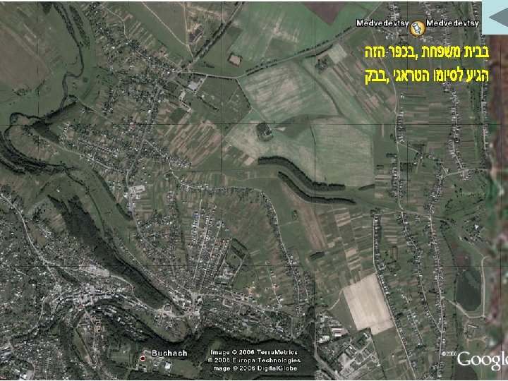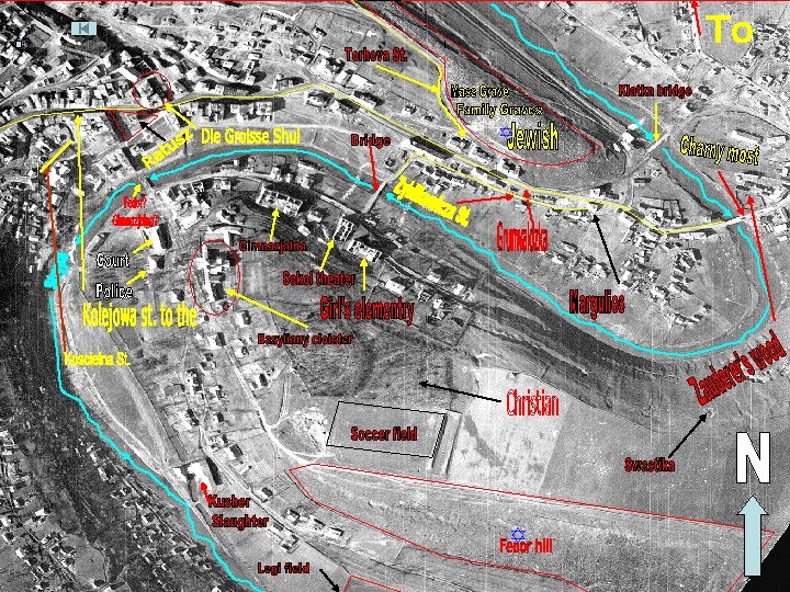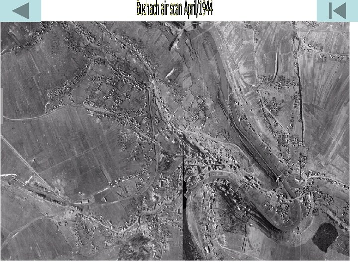 Buczacz air scan The image was produced by combining 4 aerial photographs of Buchach. The 4 original photographs were taken on April 15, 1944 by the German Air Force and were captured by the Allies. A more detailed history of Buchach during WWII is available from Martin Rudner and from sections of the Yizkor book for Buchach entitled Second Witness and Third Witness. Briefly, Buchach was occupied by German forces on July 7, 1941; liberated by Russian forces on March 23, 1944; recaptured in a counter attack by German forces on April 3, 1944; and finally liberated by Russian forces on July 21, 1944. These photos are probably reconnaissance photos taken in connection with the German counter attack. The image shown below was produced by combining the 4 digital files. The original photographs were taken at 4 pm and the shadows of trees and houses suggest that north is up in the photograph. Compare this aerial photograph to the detailed map of Buchach. The S-shaped course of the Strypa river are clearly seen in both the map and the photograp. The aerial photographs were enlarged and image processed to reveal details of Buchach: The center of Buchach showing the bridges over the Strypa river, the Jewish cemetery, the Fedor hill, many landmarks, and a large swastika carved in the side of a cliff. The center of Buchach with annotations identifying many key sites in the town. The annotations were obtained largely through the efforts of former Buchach resident Etunia Bauer Katz (see her book in the Bibliography) and her daughter Felice Katz plus Alexander Dunai and 5 -6 Burchach residents who stopped to examine the aerial photographs and to identify sites. If anyone can identify any other sites please get in touch with Tom Weiss and the new sites will be added to the image. During the holocaust, thousands of Jews were shot at a number of sites in Buchach including: the Jewish cemetery, Fedor hill, and Legi field. (2) a detail of the swastika carved in the side of a cliff; (3) a detail of one of the bridges showing vehicles on the bridge and craters (from bombs? ) along the edges of the river (4) a detail of the Jewish cemetery.