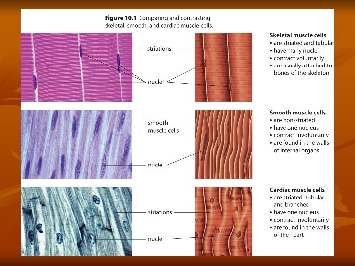 Muscles n 3 main types of muscles: n 1) Cardiac Muscles: heart muscles Found only in the heart n Involuntary contraction and relaxation. Why? It is controlled by nerves of the autonomic nervous system and always has to be pumping in order to pump blood (which contains oxygen, nutrients, and other important molecules) to all of the cells of the body. n