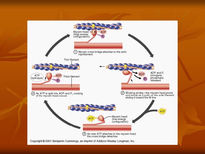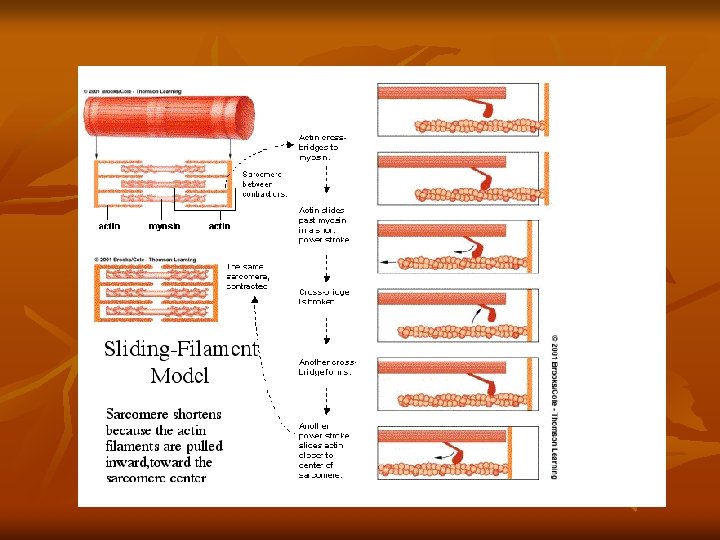 n Calcium ions also start the break down of ATP, which allows the actin to de-attach each time from the myosin and also provides the energy for contraction to occur. (Recall: when ATP is broken down, energy is given off) If no ATP is present, rigor mortis occurs: This occurs after death, myosin and actin stay attached, thus muscles stay fully contracted. The body is stiff as a board! n Muscle. Animation n