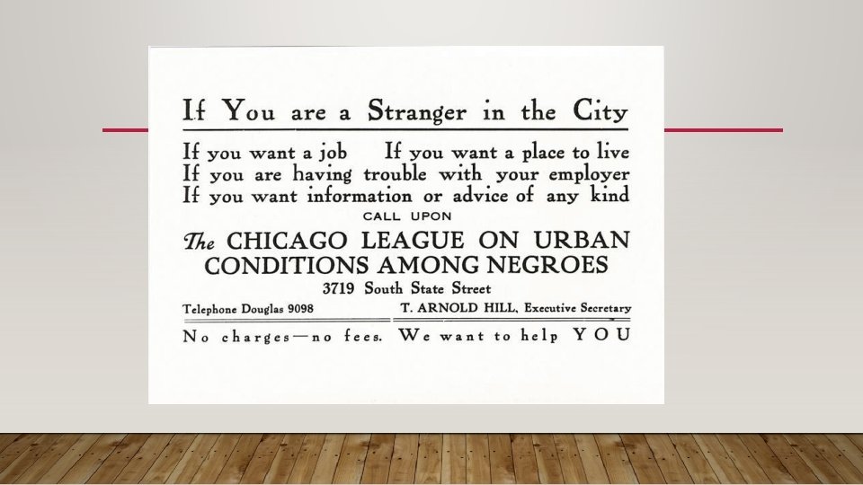 THE GREAT MIGRATION • Large Movement of African-Americans from South to Northern Cities. • “They left as though they were fleeing some curse, ” wrote the scholar Emmett J. Scott, an observer of the early years of the migration. “They were willing to make almost any sacrifice to obtain a railroad ticket and they left with the intention of staying. ” • https: //www. census. gov/dataviz/visualizations/020/ (graphs of movement) • Which cities had the largest growth? Which areas had the largest decline? • What effects would this movements have on the culture/lifestyle of these cities. • By 1930, 10% of American’s African population had relocated. • Why the North, industrialization offered employment opportunities for African-American Families. Cities like Detroit, Chicago, Milwaukee, New York, Boston, Philadelphia, Los Angele all offered chances for employment in a growing labor force.