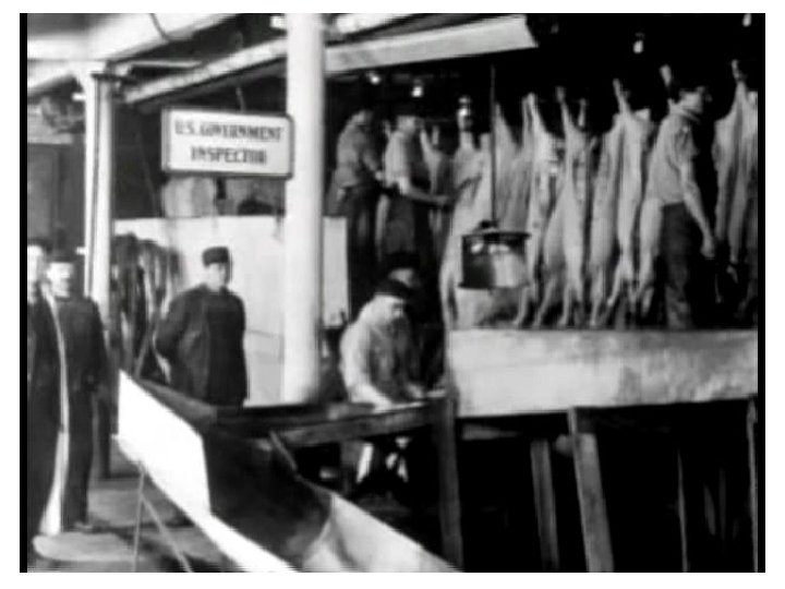 The Jungle Excerpt • There was never the least attention paid to what was cut up for sausage; there would come all the way back from Europe old sausage that had been rejected, and that was moldy and white—it would be dosed with borax and glycerine and dumped into the hoppers and made over again for home consumption. There would be meat that had tumbled out on the floor, in the dirt and sawdust, where the workers had tramped and spit uncounted billions of consumption germs. There would be meat stored in great piles in rooms; and the water from leaky roofs would drip over it, and thousands of rats would race about on it. It was too dark in these storage places to see well, but a man could run his hand over these piles of meat and sweep off handfuls of the dried dung of rats. These rats were nuisances, and the packers would put poisoned bread out for them, they would die, and then rats, bread, and meat would go into the hoppers together. The meat would be shoveled into carts, and the man who shoveled would not trouble to lift out a poisoned rat even when he saw one—there were things that went into the sausage in comparison with which a poisoned rat was a tidbit. There was no place for the men to wash their hands before they ate their dinner, and so they made a practice of washing them in the water that was to be ladled into the sausage. There were the butt-ends of smoked meat, and the scraps of corned beef, and all the odds and ends of the waste of the plants, that would be dumped into old barrels in the cellar and left there. Under the system of rigid economy which the packers enforced, there were some jobs that it only paid to do once in a long time, and among these was the cleaning out of the waste barrels. Every spring they did it; and in the barrels would be dirt and rust and old nails and stale water—and cart load after cart load of it would be taken up and dumped into the hoppers with fresh meat, and sent out to the public's breakfast. Some of it they would make into "smoked" sausage—but as the smoking took time, and was therefore expensive, they would call upon their chemistry department, and preserve it with borax and color it with gelatine to make it brown. All of their sausage came out of the same bowl, but when they came to wrap it they would stamp some of it "special, " and for this they would charge two cents more a pound. . ENJOY YOUR JIMMY DEAN!!!