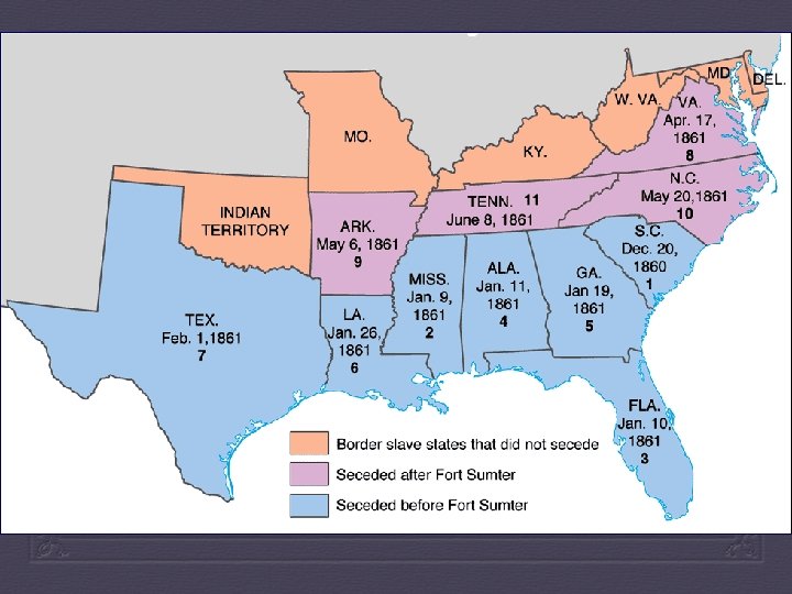 The South Secedes After Lincoln’s election Dec. 20, 1860: “The union now subsisting between South Carolina and other states under the name of the ‘United States of America’ is hereby dissolved. ” Next, Mississippi, Florida, Alabama, Georgia, Louisiana, Texas seceded The Confederate States of America Jefferson Davis is president