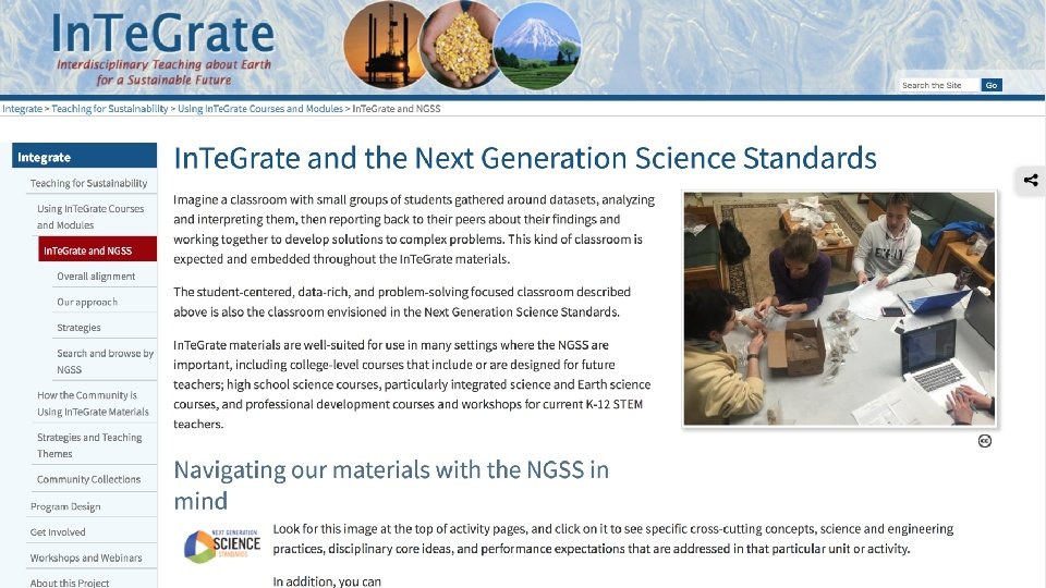 Goals for today By the end of this webinar, you will have: • Learned about the In. Te. Grate materials development rubric and how it aligns with the Framework for K 12 Science Education and the NGSS • Explored the In. Te. Grate materials using the NGSS driven search and browse functionality • Considered how to adapt materials to your setting to facilitate three dimensional learning