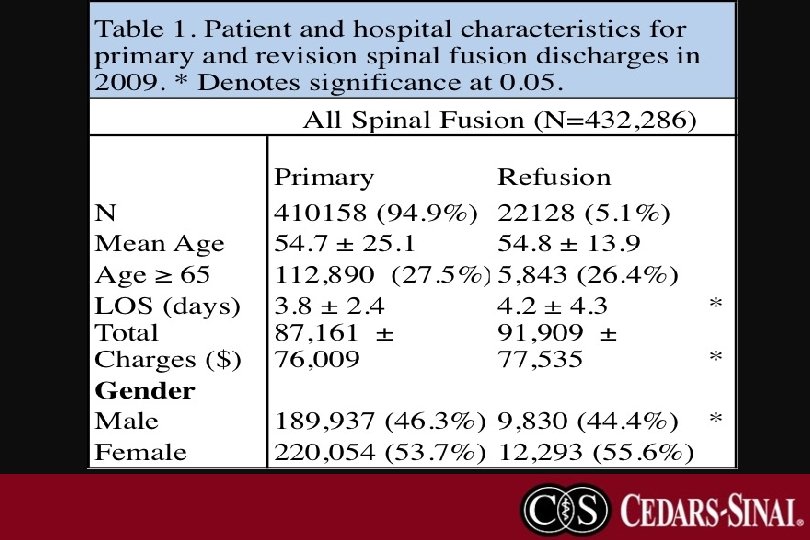 Study Purpose n Trends in revision fusion are lacking n Mission n 1. Present National trends in revision spinal fusion n 2. Compare patient characteristics and complications between primary spinal fusion and revision n 3. Compare the use of BMP, interbody devices, and fusion of multiple levels n 4. Present the most common pre-op diagnosis for revision fusion