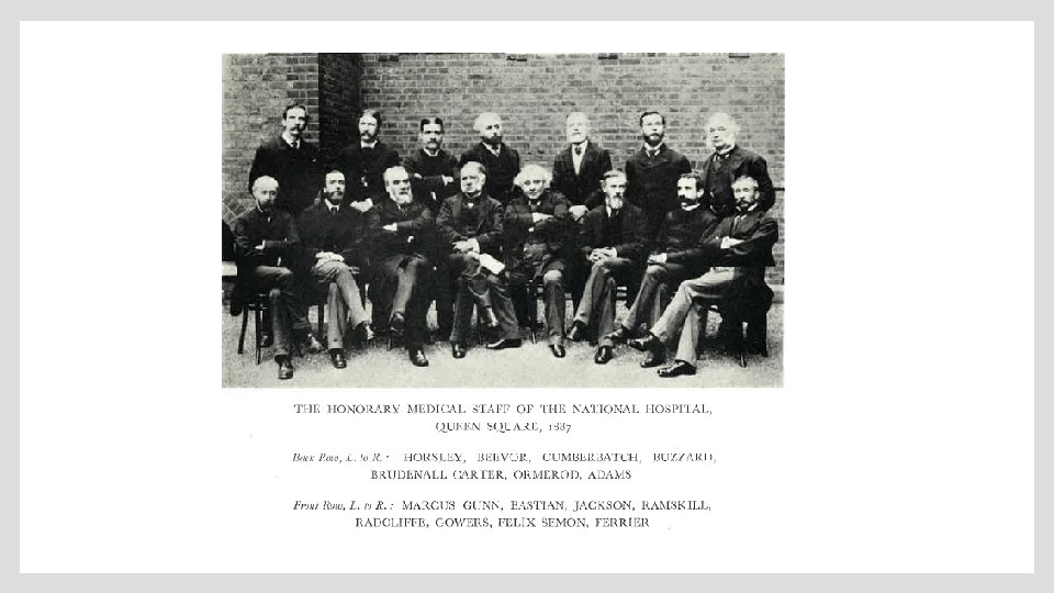 Some Physicians at The National Hospital for Neurology and Neurosurgery – Queens Square • 1859 – Appointed 1 st 2 physicians: • James Ramskill (1825 -1897) • Charles Eduoard Brown-Sequard (1817 -1894) • 1862 – John Hughlings Jackson • 1863 – Charles Bland Radcliffe • 1867 – H. Charlton Bastion • 1872 – Sir William Gowers • 1880 – Sir David Ferrier • 1883 – C. E. Beevor • 1886 – Sir Victor Horsley (Surgeon) • 1886 – Marcus Gunn (Opthomologic Surgeon) • 1887 – Howard H. Tooth • 1891 – Sir Charles Ballance (Surgeon) • 1893 – James Taylor • 1909 – Sir Gordon Holmes • 1912 – S. A. Kinner Wilson • 1914 – J. G. Greenfield (Neuropathology) • 1921 – Sir F. M. R. Walls • 1921 – W. J. Addie • 1924 – G. Riddoch • 1926 – Sir C. P. Symonds • 1928 – Mc. Donald Critchley • 1935 - Derek Denny-Brown • 1944 – C. S. Hallpike