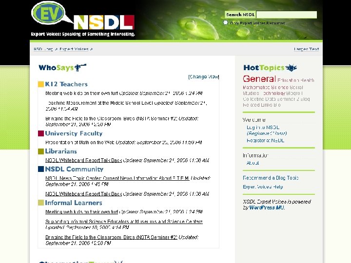 Expert Voices – NSDL-integrated blogging § Models scientific inquiry and the exposes the processes of scientific research § Promotes and facilitates conversations between research and education communities § Brings content expertise into the classroom to support out-of-field teachers § Allows scientists, teachers, and media specialists to collaboratively develop instructional context around NSDL resources