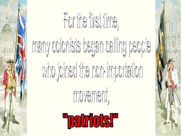 Colonial Response to the Townshend Acts 1. Colonists Refused to Import British goods (boycotts) 2. Riots against customs agents: * John Hancock’s ship, the Liberty. * 4000 British troops sent to Boston where violence and protests had been the worst
