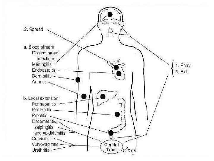 In both sexes Anorectal infection In men – due to rectal intercourse by homosexuals. In women – usually due to perineal contamination with the mucopurulent discharge. Bacteraemia which may lead to metastatic infection such as arthritis, endocarditis, meningitis, pyemia & skin rashes. Pharyngeal infection Due to orogenital sex, usually, asymptomatic.