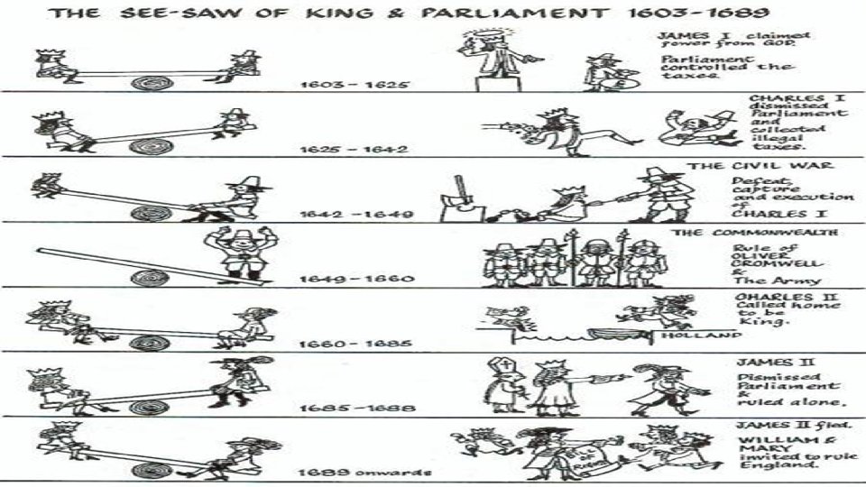 Restauration • Death of Charles II (1688) • His brother James II (Catholic) on the throne • James II’s Protestant daughter, Mary and her husband William invited to rule England, but they must obey parliament’s wishes • James II flees and the divine right to rule is over. • William and Mary sign the Bill of Rights Detail of William and Mary as portrayed on the ceiling of the Painted Hall of the Greenwich Hospital