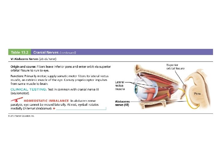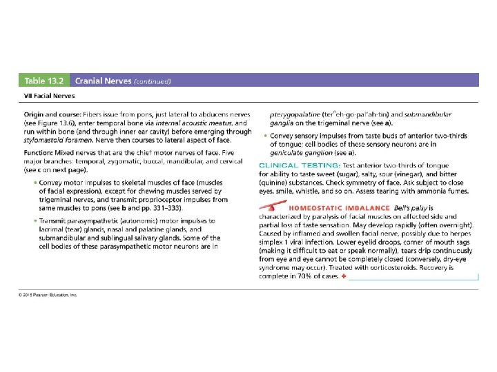 THE NERVOUS SYSTEM 9. Vestibulocochlear nerve (VIII) - two separate nerves from inner ear a. vestibular = semicircular canals - Function: equilibrium b. cochlear = cochlea - Function: hearing 10. Vagus nerve (X) - afferent = taste, abdominal & thoracic organs - efferent = soft palate, pharynx, larynx, heart, and smooth muscles, and glands