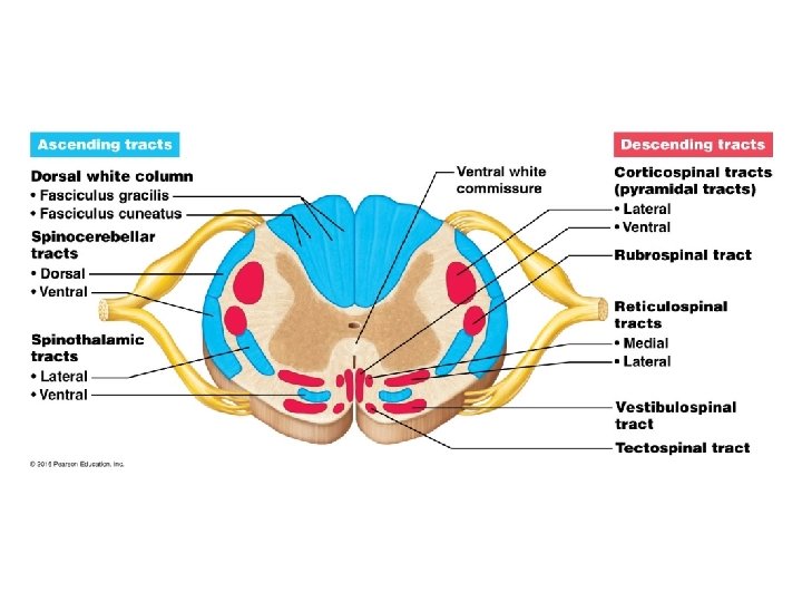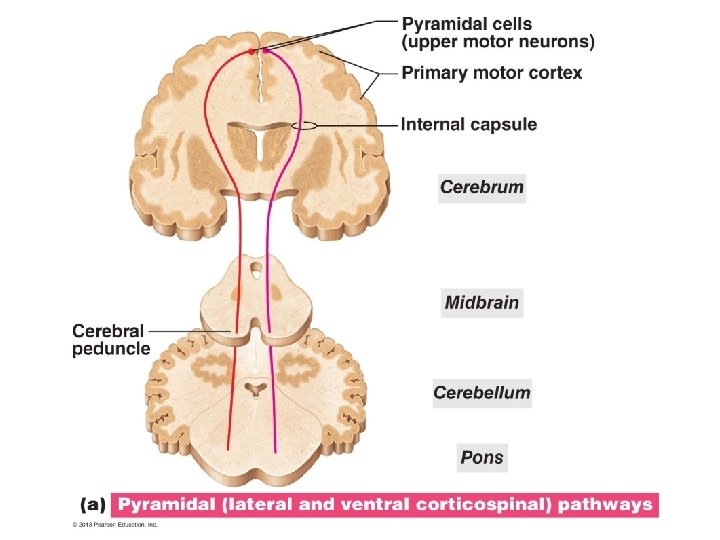 THE NERVOUS SYSTEM B. Motor pathways - Resulting in response at effector organ - All descending - Require 2 neurons a. cerebral cortex b. spinal cord muscle (upper motor neuron) (lower motor neuron) 1. Corticospinal tracts (pyramidal) - Impulses result in voluntary skeletal muscle movement - 90% of fibers cross over at medulla