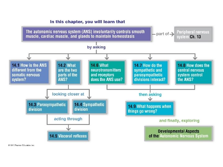 THE NERVOUS SYSTEM AUTONOMIC NERVOUS SYSTEM (ANS) - Consists of motor neurons to smooth muscle, cardiac muscle, and glands. - Depending on the type of receptor, the neurotransmitter released may either excite or inhibit the effector. Two neurons 1. Preganglionic - cell body located in brain and spinal cord 2. Postganglionic - completely outside of CNS