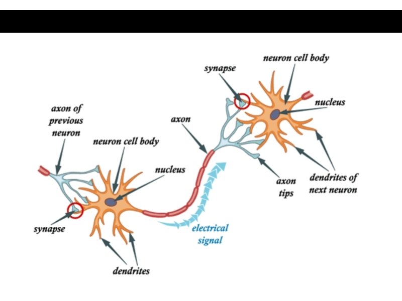 Axon - long section, transmits impulses Dendrite - small extensions from the cell body; receive information Neurofibrils - fibers within the axon