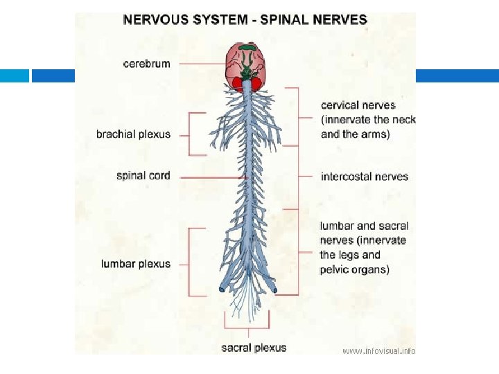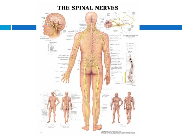 Spinal Nerves 31 -pairs originate from the spinal cord Mixed nerves provide 2 -way communication b/w spinal cord and upper and lower limbs, neck, and trunk Grouped according to the levels from which they arise Emerges from a dorsal and ventral root Divides into branches beyond its foramen Most combine to form plexuses � Nerve fibers are sorted and recombined so that those associated with a particular region reach it together