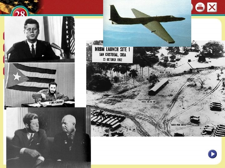 SECTION continued Crises over Cuba The Cuban Missile Crisis 1 • Nikita Khrushchev sends weapons to Cuba, including nuclear missiles • JFK warns Soviets that missile attack will trigger war on U. S. S. R. USA sets up NAVAL blockade of Cuba…. . • Soviets avoid confrontation at sea; reach agreement with U. S • they pull missiles out of Cuba in exchange we secretly pull missiles out of Turkey 6 months later. Interactive Kennedy and Khrushchev Take the Heat • Khrushchev’s prestige severely damaged in U. S. S. R. • JFK criticized for brinkmanship, also for not ousting Castro • Cuban exiles switch to GOP; Castro bans flights to and from Miami NEXT